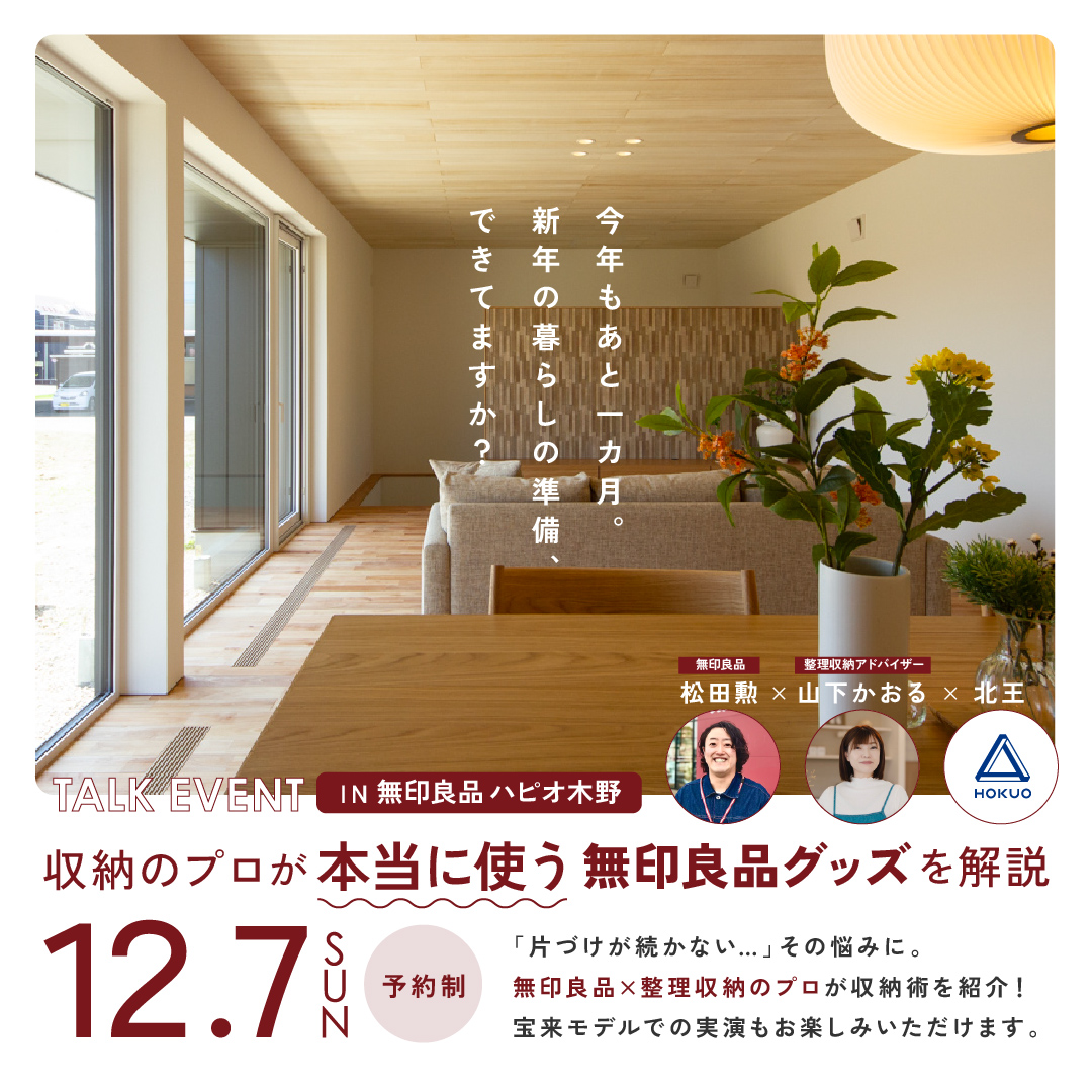 当日は、みなさまから事前にいただいた質問は、当日“匿名で”少しだけご紹介させていただくことがあるかもしれません。 住まいや片づけのお悩み、聞いてみたいことなど、どんな内容でもお気軽にどうぞ。